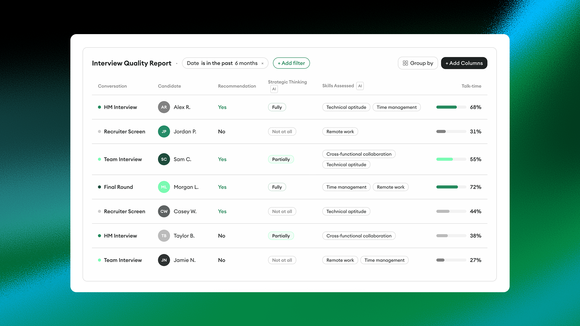 Crucially, the dashboards let the team focus on objective facts. It created accountability without being punitive. Each interviewer could see their own quality score, strengths, and gaps.