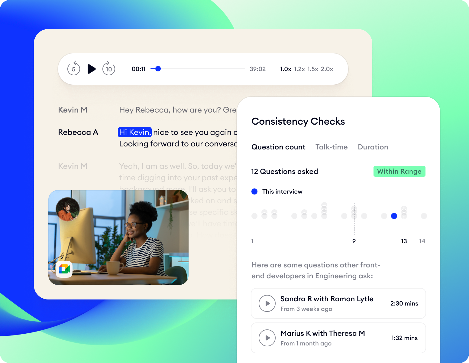 The ability to playback interview recordings is a game changer when it comes to keeping quality high. When there’s conflicting opinions on a candidate or disagreement about how they rank on a certain skill, you can review what actually happened, even if you weren’t present yourself. Visibility into what’s really going on in interviews can also be a powerful tool to ensure interviewers are delivering a strong candidate experience and gathering the right signal. Tally’s VP of Engineering, Jan Chong, shares how Metaview playbacks help her team keep quality in check: