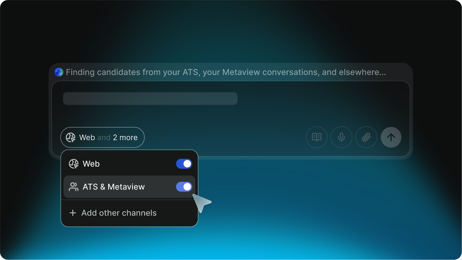 - Kick off a search with a natural prompt (voice or text). Choose your sources: open web, ATS, and Metaview conversations.
