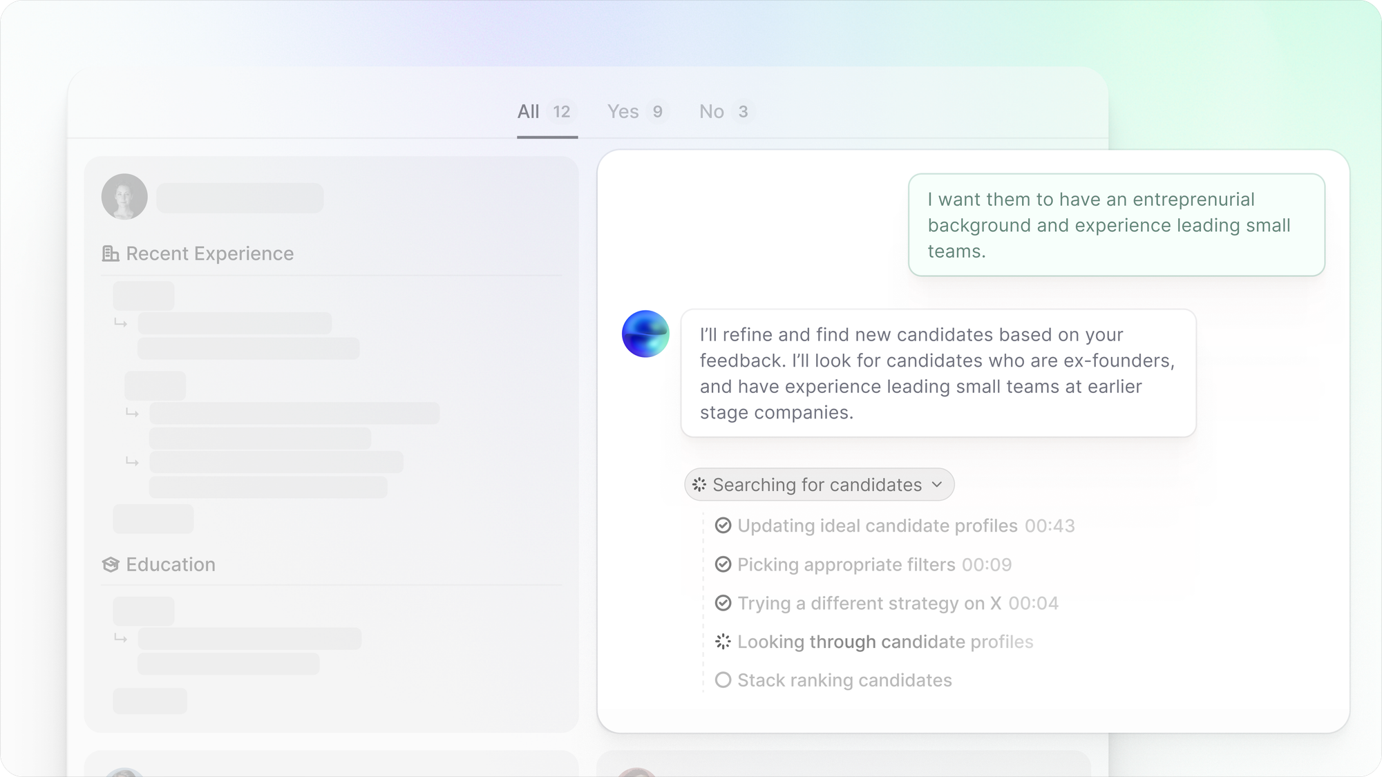 The agent takes your feedback onboard to refine sourcing. Like a candidate? It finds more just like them. Not the right fit? Explain why, and it adapts to bring better matches.