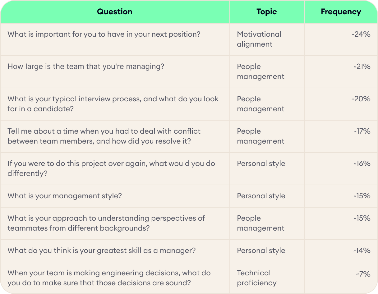 Here's a recap of the most common questions, ranked by overall frequency of mention in hiring manager interviews for engineering leaders: